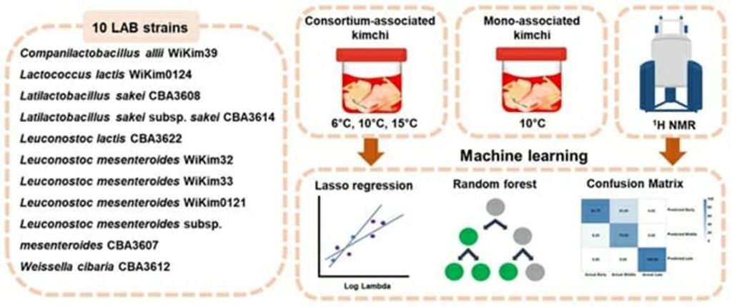 今回研究チームが構築したモデルは、乳酸菌を人為的に接種して発酵を進めることで、微生物の構成変化や発酵特性を精密に分析することができる。10種類の乳酸菌を同一の比率で混合するか、単独で接種した無菌キムチを6度・10度・15度の条件下で発酵させ、温度と乳酸菌の種類による発酵特性を体系的に比較・分析した。