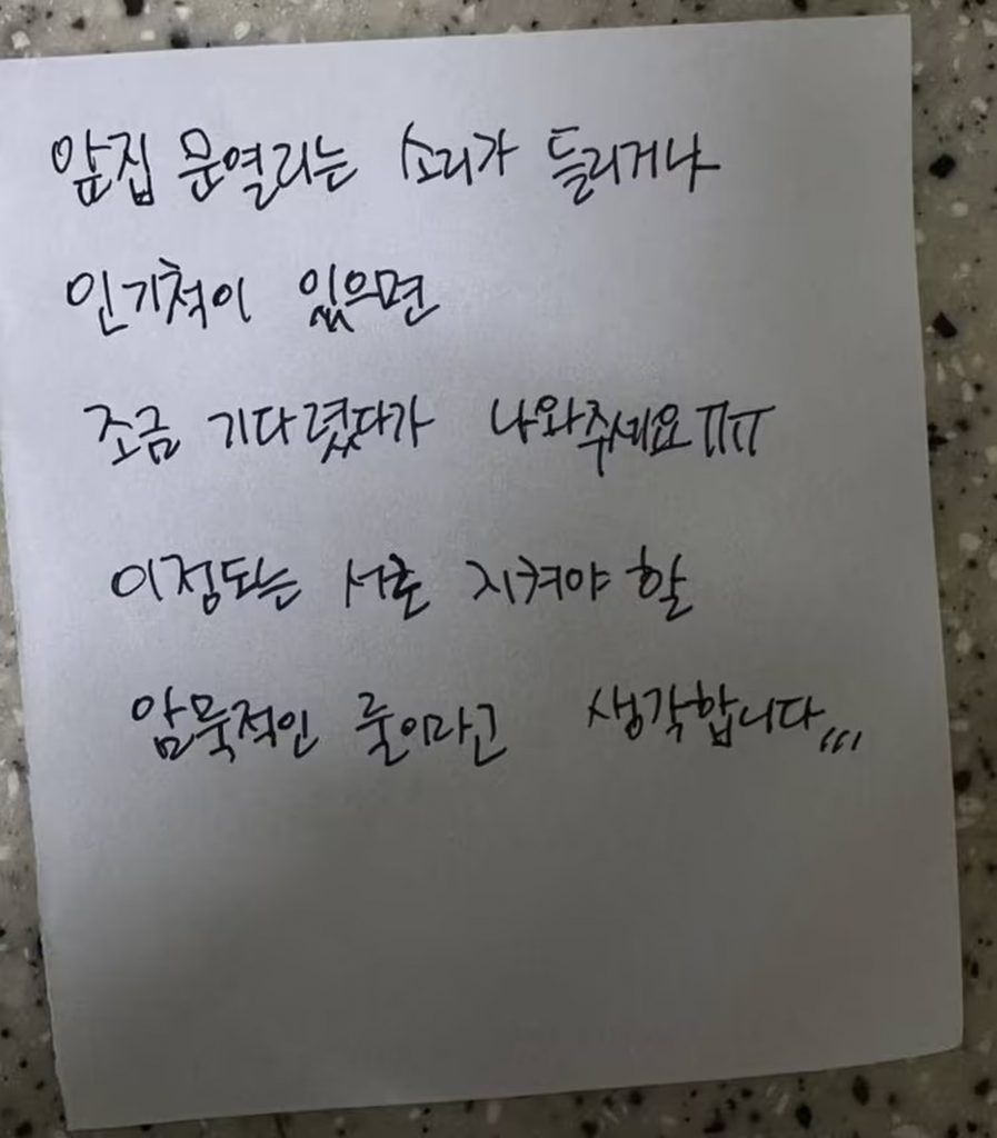 「前の家のドアの開く音が聞こえたら、しばらく待ってから出るのが暗黙のルールです」――。韓国のSNSやオンライン掲示板で、前の部屋の住人からこんな奇妙なメモを受け取った住人の話が話題になっている。
