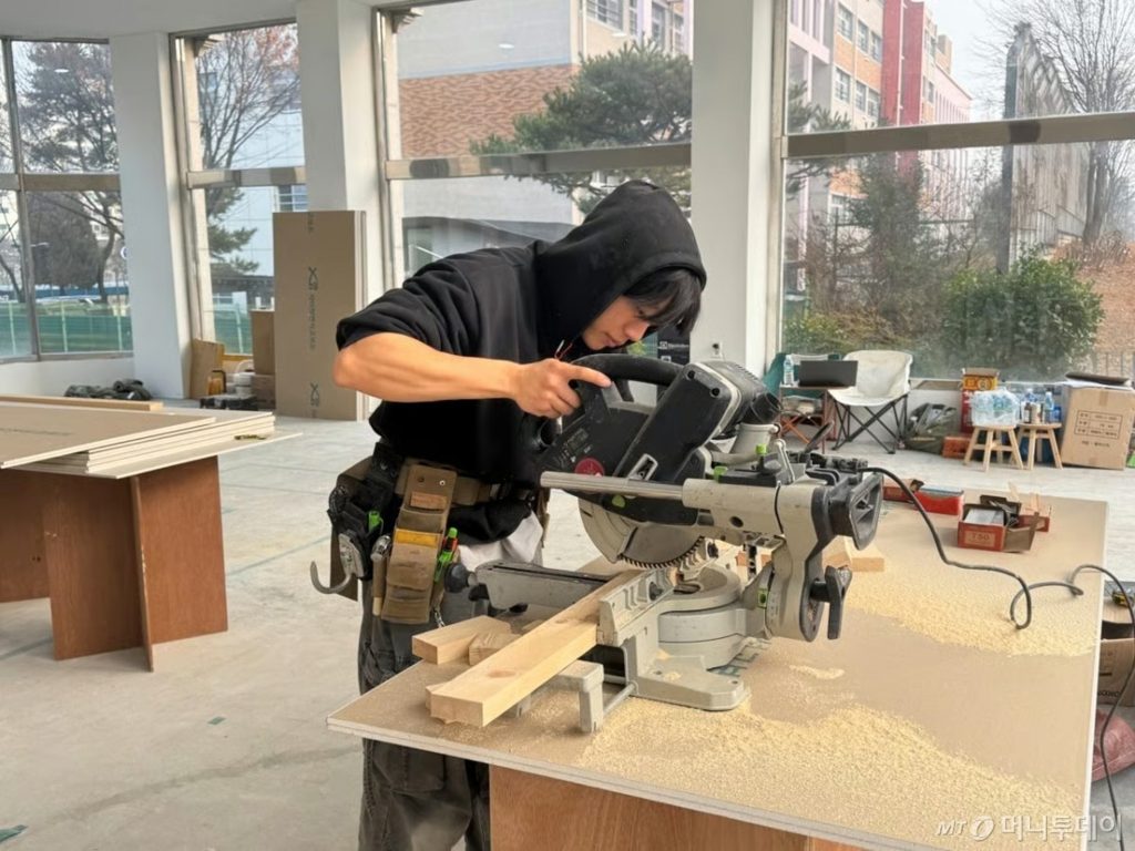京畿道安山市のカフェ改装現場。3人の若い大工が、木材を用いて新店舗の空間づくりに励んでいた。現場は木くずが舞い、寒さの中でも換気のため扉は開け放たれていた。だが、彼らの表情は明るい。