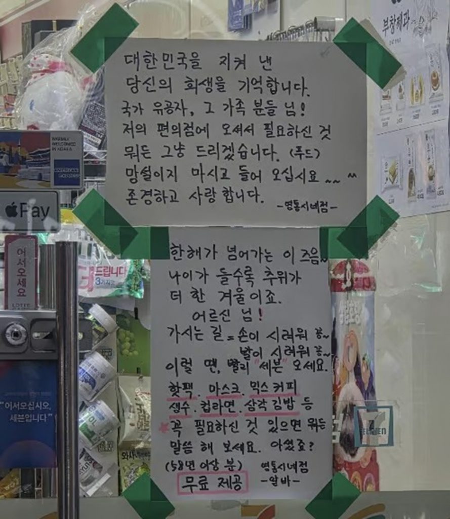 そこには店主名義で「大韓民国を守ってきたあなたの犠牲を忘れない。国家功労者とその家族には必要なものは何でも無料で差し上げる。遠慮せず入ってきてほしい。尊敬し、愛している」と書かれている。