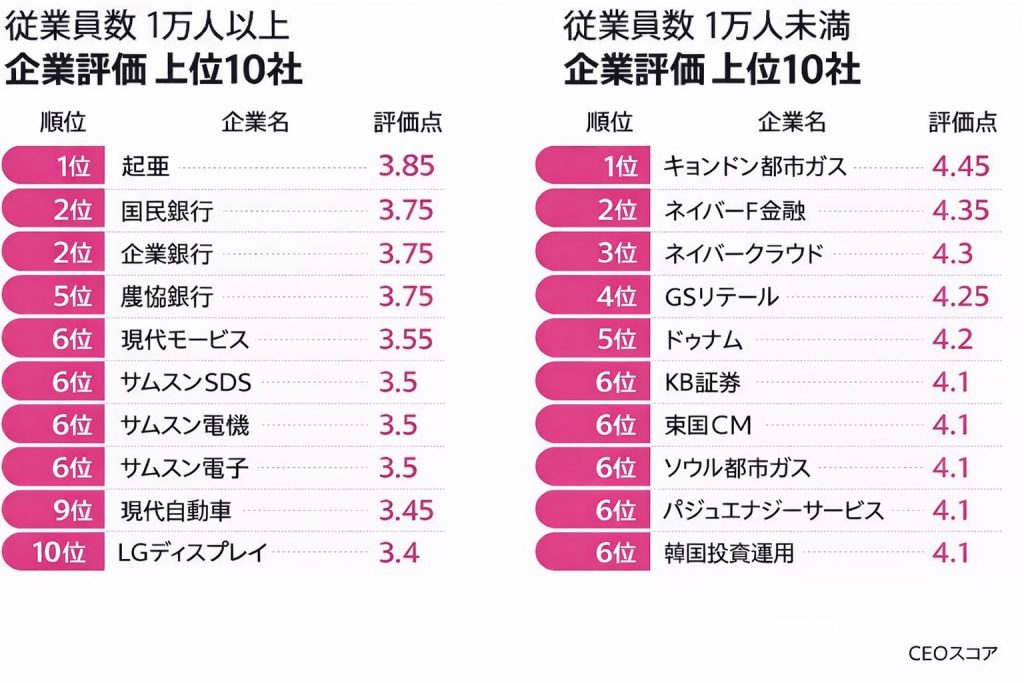 CEOスコアによると、売上高基準で500大企業を対象に、オンライン企業評価プラットフォーム(ブラインド、ジョブプラネット)に公開された昨年末時点の組織文化評価を分析した結果、従業員数1万人以上の民間企業の中では、起亜が平均3.85点で1位を記録した。