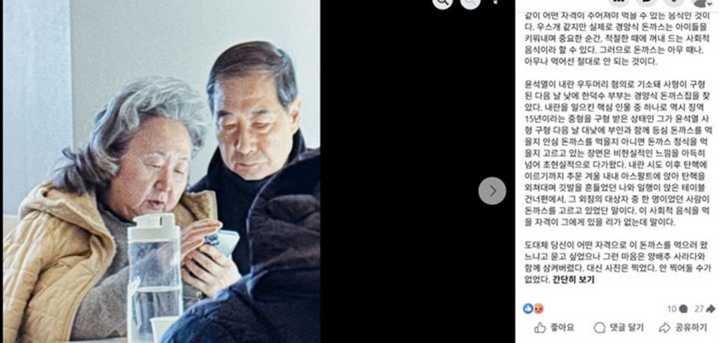 また、15日には写真家のチェ・ハン氏がフェイスブックに、ハン・ドクス氏夫妻がとんかつ店を訪れていたとする写真を投稿。「求刑の翌日に妻とメニューを選ぶ姿は超現実的だった」と感想を述べた。さらに、「弾劾を訴え続けた市民と向かい合うように座っていた」と複雑な思いを明かし、撮影に至った心情も綴った。