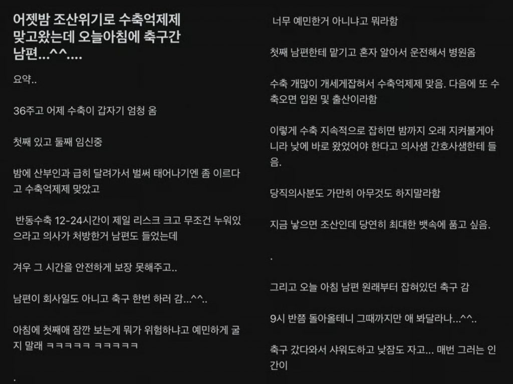 韓国で、早産の危険に直面している妊婦を残してサッカーに出かけた夫の行動が伝えられ、批判が広がっている。