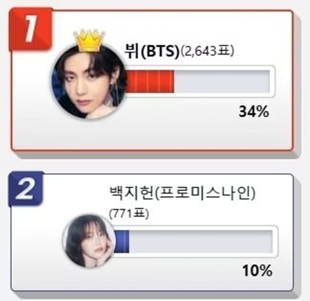 総投票数7989票のうち、2643票(34%)を獲得して1位に輝いたのはV。コカ・コーラやサムスンなど、さまざまなブランドのモデルとして活動しており、“広告界のブルーチップ”とも称されている。BTSは今年3月にカムバックを控えている。