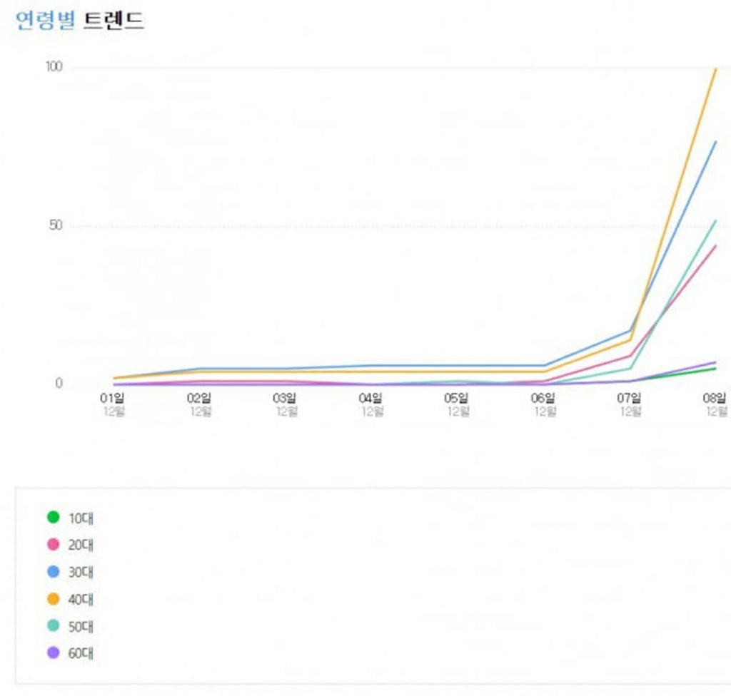応援棒の検索数は6日から徐々に増え始め、8日に急増した。特に40代の検索数が顕著に増加し、それに次いで30代、さらに50代の検索数も大幅に増加した。応援棒を持ってデモに参加したいという40~50代が増えたためとみられる。