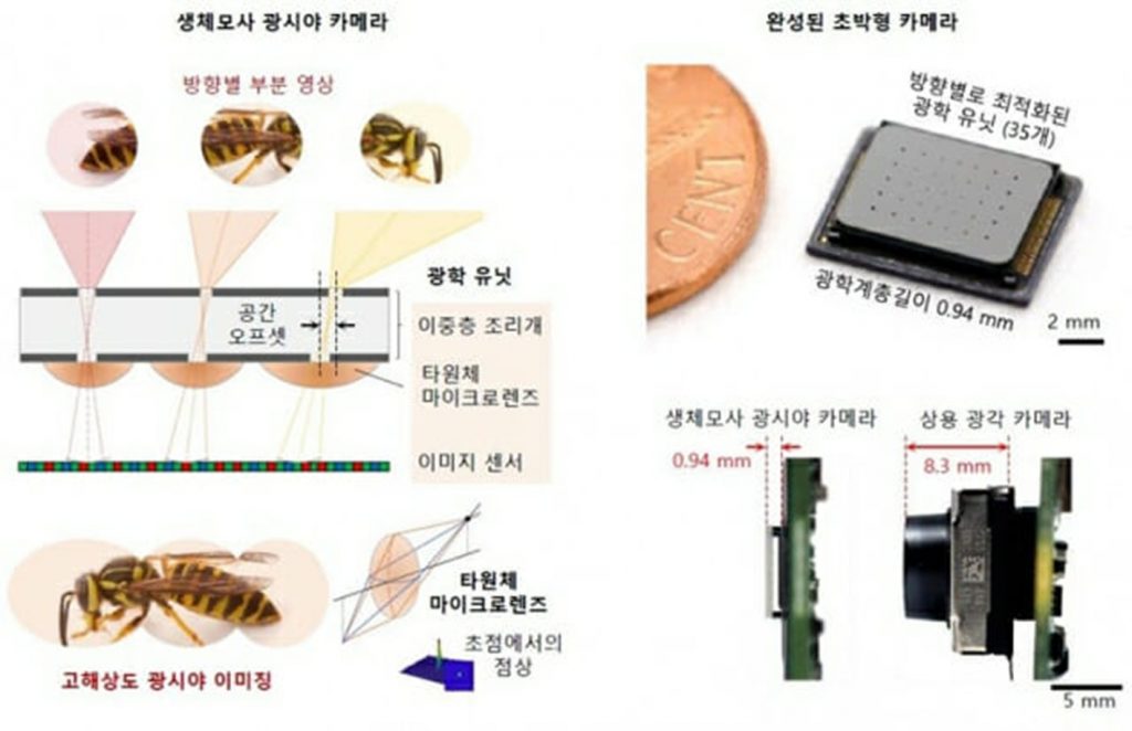 韓国科学技術院(KAIST)のチョン・ギフン生命・脳工学科教授とキム・ミンヒョク電算学部教授の共同研究チームが、昆虫の視覚原理を応用した「広視野バイオミメティックカメラ」を開発した。スマートフォンのカメラの厚さを、髪の毛の太さレベルである0.94mmにできる革新的な超薄型カメラで、来年の製品商用化を目標に、技術移転もすでに完了した。