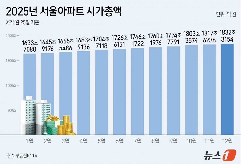 不動産市場専門機関「不動産R114」によると、2025年12月25日現在のソウルのマンション売買時価総額は1832兆3154億ウォンで、前月比0.8%(約14兆6900億ウォン)増加した。