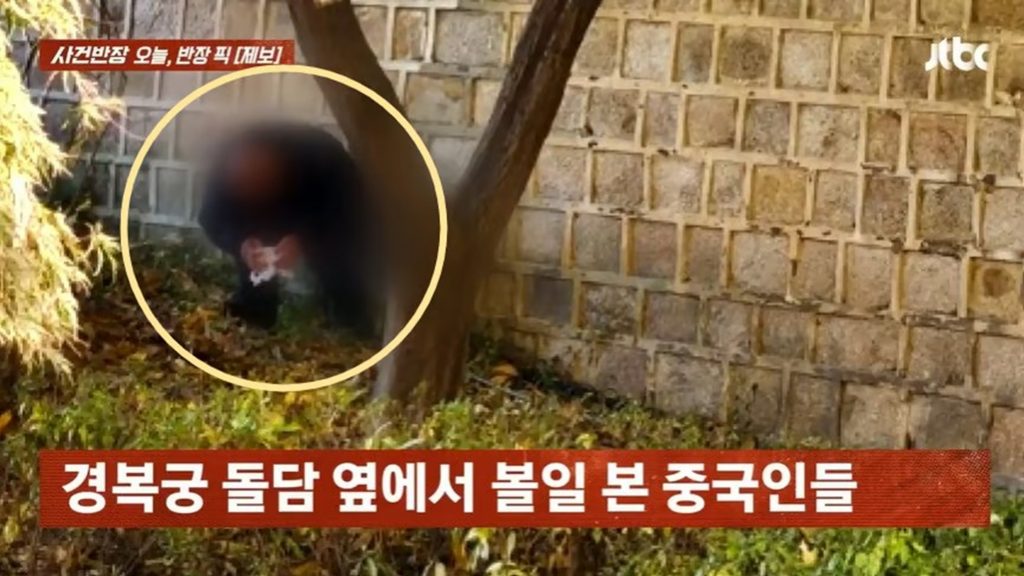 ソウル・景福宮(キョンボックン)近くの石垣の下で、男女が並んでしゃがみ込んで排便する姿が撮影され、物議を醸している。