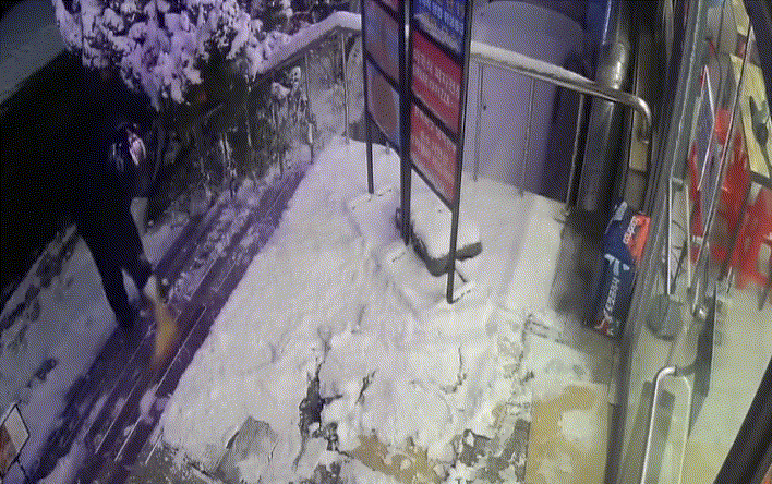 記録的な大雪に見舞われた12月4日夜、ソウル市江南区(カンナムグ)のピザ店前で、商品の受け取りを待つ配達員が雪かきをする姿が監視カメラに捉えられ、称賛を集めている。