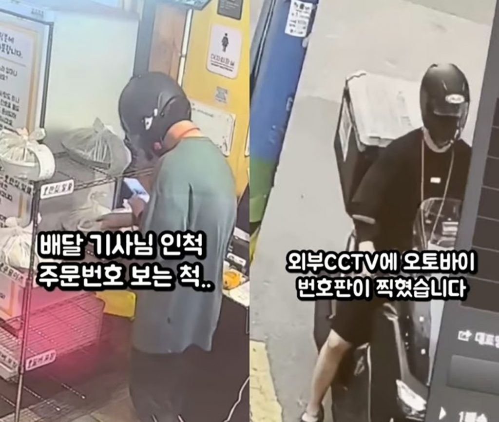 映像には、ヘルメットを着用した男が配達員を装って店内に入り、棚に置かれていた配達用の料理を自然に持ち去る様子が映っていた。男は注文番号を確認するふりをして従業員の目を欺いていた。