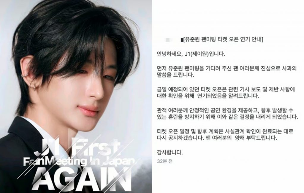 韓国のオーディション番組「少年ファンタジー」から誕生したグループ「ファンタジーボーイズ」の元メンバー ユ・ジュンウォンが、専属契約違反をめぐる紛争の中、日本で予定していたファンミーティングを直前で延期した。