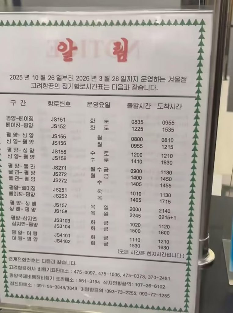 平壌とロシア・ウラジオストクを結ぶ便も週3便(月・水・金)で継続運航されている。また、平壌から北部の観光地「三池淵」や「漁郎」への国内線も、毎週火曜と金曜に定期便として運航されていることが判明した。