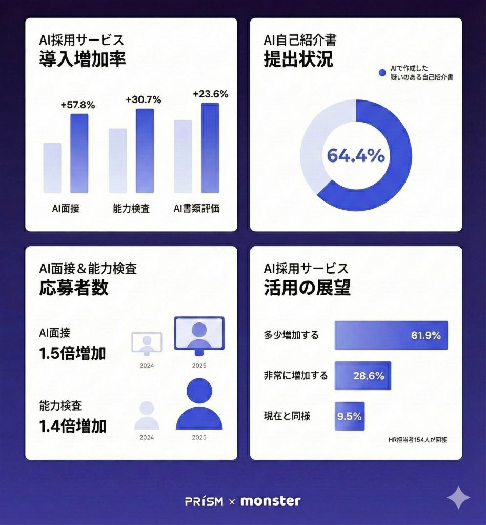 AI書類分析サービス「プリズム(Prism)」の導入企業も2024年比で23.6%増えた。「プリズム」はAI作成文の判定、自己PR内容の評価、経験に基づくカスタム面接質問ガイド提供などの機能を備える。