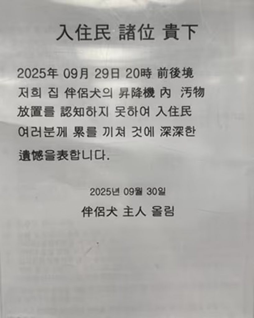 ソウルのマンションで、愛犬の排せつ物を片付けずに立ち去った飼い主が「漢字だらけの謝罪文」を掲示し、騒ぎを大きくする出来事が起きた。住民がオンラインコミュニティ「ボベドリーム」に経緯を投稿した。