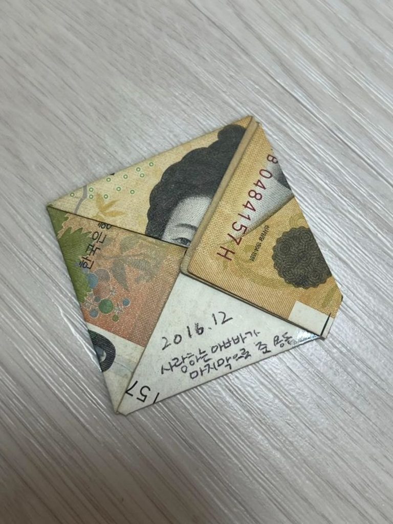 投稿には、丁寧に折り畳まれた5万ウォン札の写真が添付され、その下に「2016.12. 愛するお父さんが最後にくれたお小遣い」と手書きの文字が添えられていた。