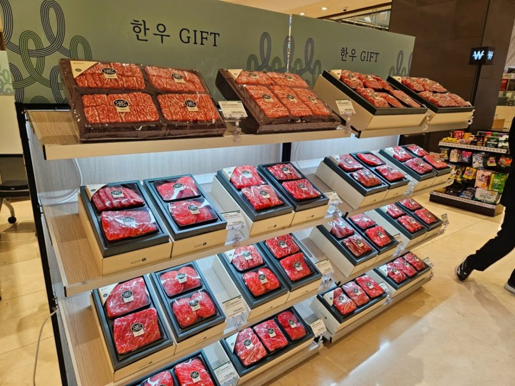 店頭の値札にも上昇が表れた。1月28日午前、広津区の百貨店では韓牛ギフト特選(2キロ)が1+等級43万ウォン、1++等級48万ウォンに設定された。名節の定番料理カルビチム用の冷蔵カルビも、2.4キロで30万ウォン台。プレミアムセット(5キロ)は169万ウォンに達した。