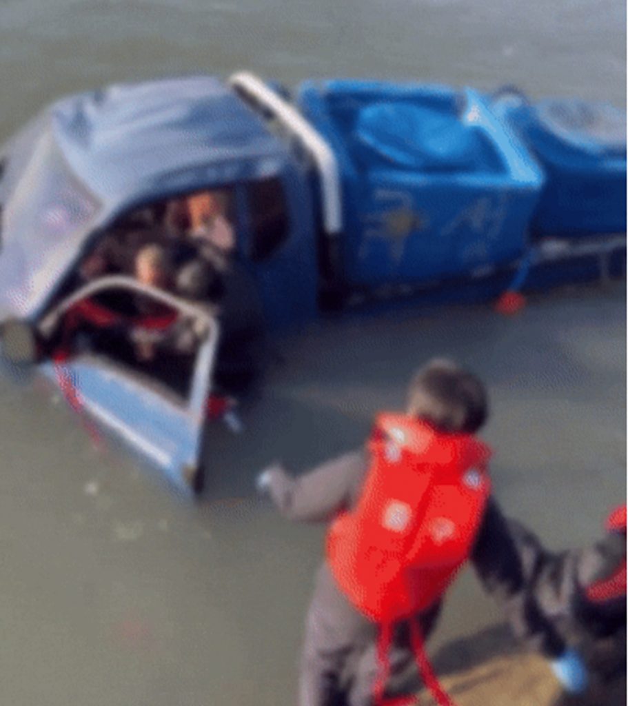 11月下旬、乙旺里の船着き場でバックしていたトラックが海中に転落。車体が半分沈んだ状態になった。
