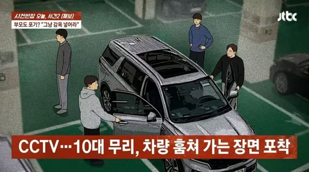 JTBC「事件班長」によると、会社員の男性は自宅に停めていた車が動いたとの通知を受け、不審に思って確認したところ車両が消えていた。防犯カメラの映像から、複数の少年が車を盗んだことが判明した。