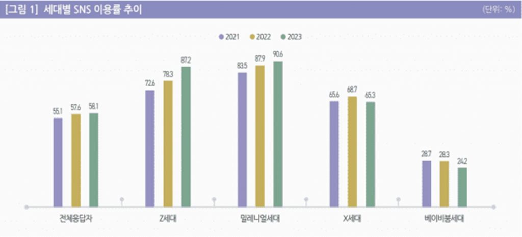 韓国情報通信政策研究院による「韓国メディアパネル調査」によると、韓国のZ世代(満9~24歳)のSNS利用率は2021年には72.6%、2022年には78.3%、2023年には87.2%と年々上昇している。