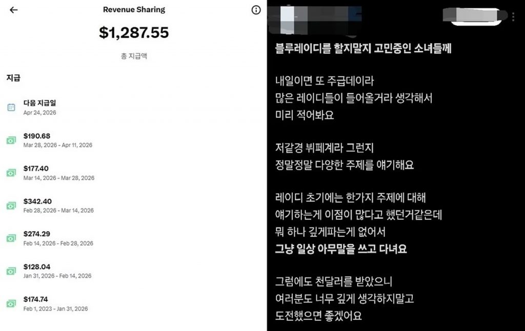 これはX(旧ツイッター)の有料サブスクリプション制度を利用したもので、一定の条件を満たすと広告収益の分配を受けられる仕組みだ。活動者は有料会員を示す青いバッジを付けることから「ブルーレディ」と呼ばれている。