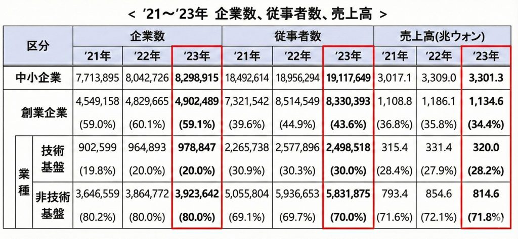 2023年時点で、創業企業は全中小企業(829万9000社)の59.1%を占めた。このうち技術基盤産業の創業企業は97万9000社で、全体の20.0%を占めた。業種別では、情報通信業(15万9000社、12.5%増)、専門・科学・技術サービス業(22万2000社、6.0%増)、教育サービス業(19万8900社、3.2%増)の順で増加した。