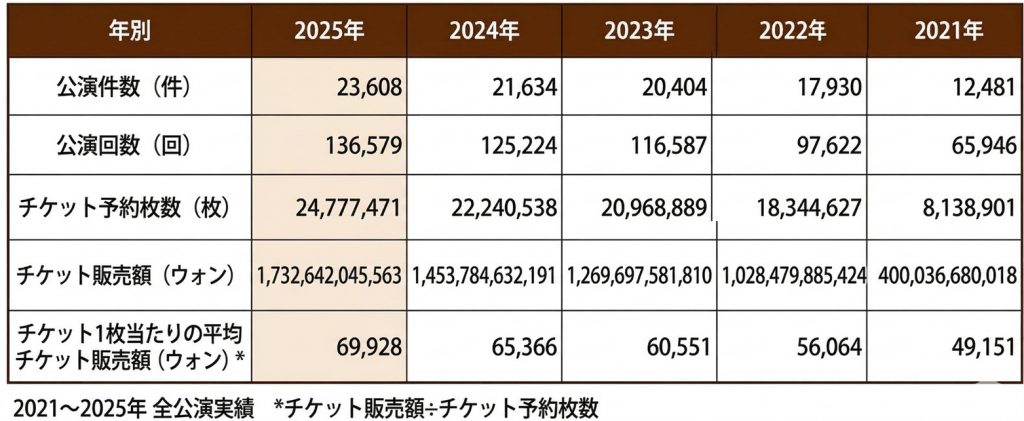 報告書は、韓国の公演市場のチケット販売額が2021年の約4000億ウォン(約430億円)から2025年には1兆7326億ウォン(約1862億5450万円)へ拡大したと分析している。