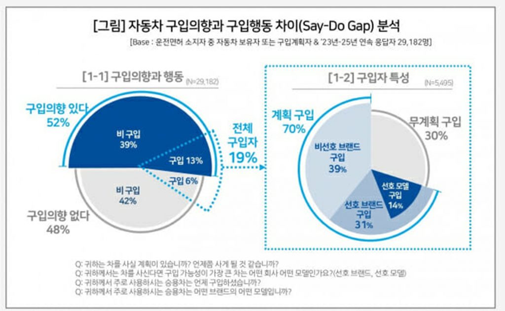 「2年以内に車を買う」という消費者の計画は、どれほど現実になったのだろうか。韓国の消費者を対象にした大規模追跡調査の結果、自動車を保有している人のうち、2年以内に購入意向があると答えた人の4人に1人が実際に車を購入し、車を保有していない人でも8人に1人は購入したことが確認された。