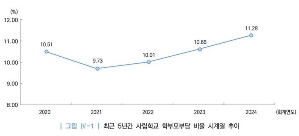 韓国教育学術情報院が7日発表した『2025年度 学校会計分析総合報告書』によると、2024年度(会計基準)の私立学校における保護者負担金総額は1兆4750億ウォンに達し、前年より707億ウォン増加した。