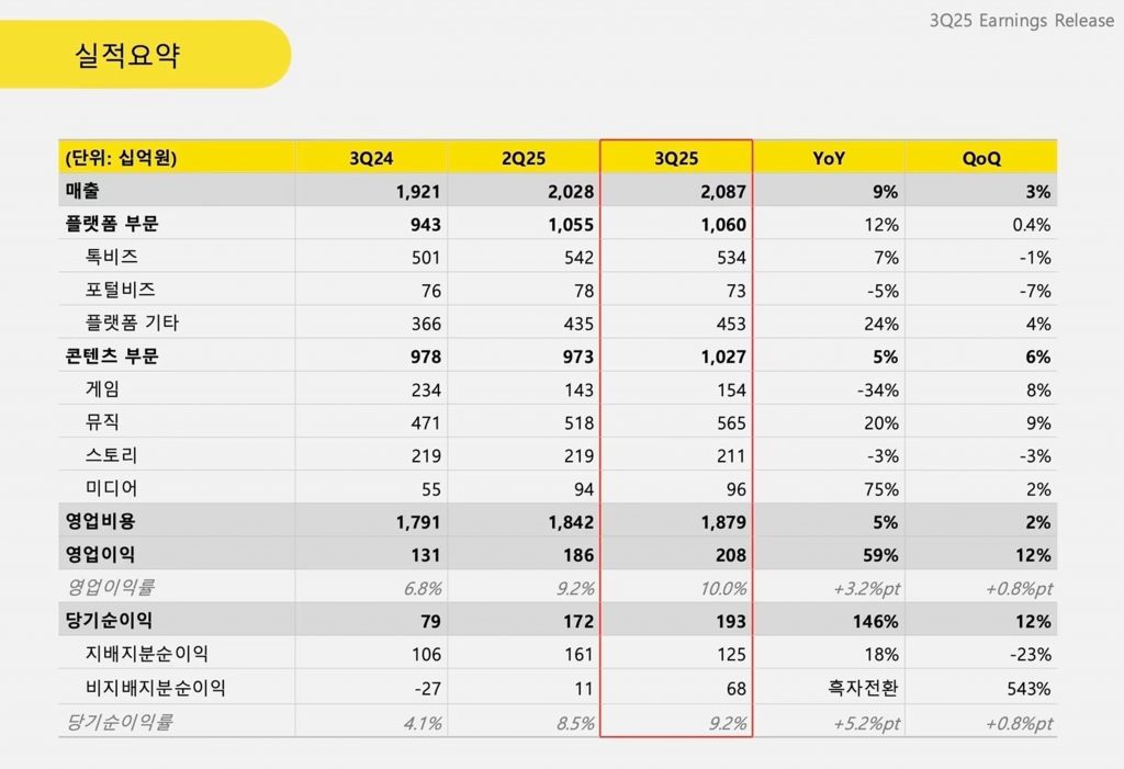 カカオは11月7日、2025年3四半期の連結基準業績を公示し、売り上げは2兆866億ウォン、営業利益は2080億ウォンを記録した。前年同期比でそれぞれ9%、59%の増加であり、過去最高だった2四半期の実績を上回った。
