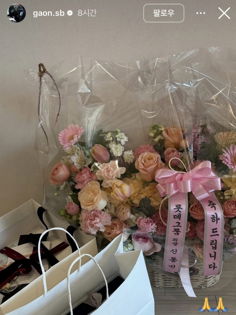 チェ・ガオン選手は17日、自身のインスタグラムのストーリーにケーキと花束の写真を掲載。花かごには「おめでとうございます。ロッテグループ シン・ドンビン」と記されたリボンが添えられていた。ケーキはロッテホテルソウル内のベーカリー「デリカハンス」の商品とみられる。