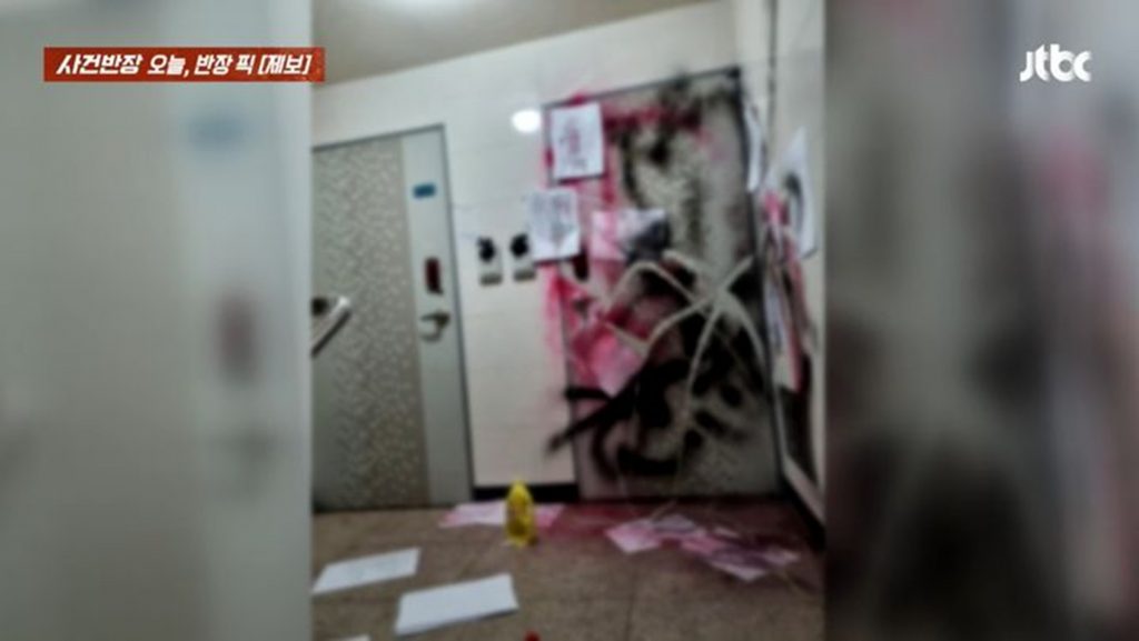 16日放送されたJTBC「事件班長」によると、釜山市機張郡の集合住宅で14日夕方、住民が出入口の扉に黒や赤のスプレー塗料が吹き付けられているのを発見した。あわせて、A4用紙に印刷された脅迫文が多数貼り付けられていた。
