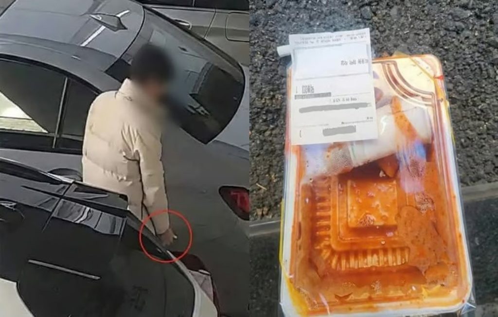 公開された写真には、男性が車内から白いプラスチック容器を取り出し、車の後方に回って地面にそっと置く姿が写っている。車が走り去った後、その場にはトッポッキの入った容器が残されていた。