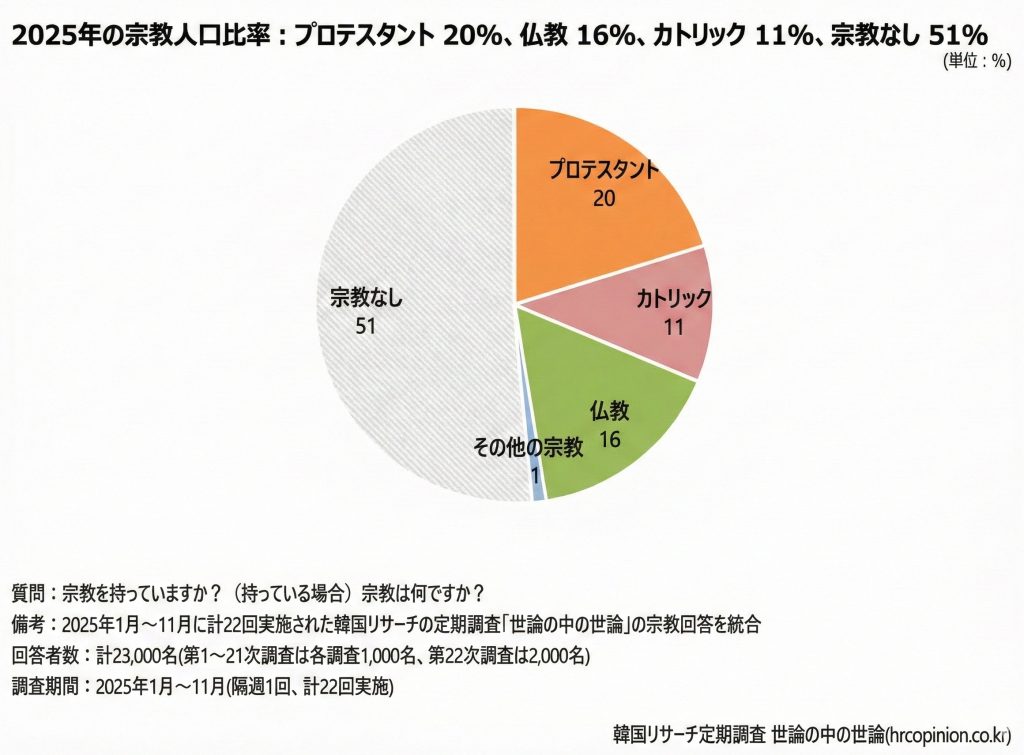 韓国リサーチが6日に発表した『2025年 宗教意識調査:宗教人口の現況と活動』によると、2025年時点での宗教人口の内訳は▽プロテスタント(キリスト教系)20%▽仏教16%▽カトリック11%――となっている。