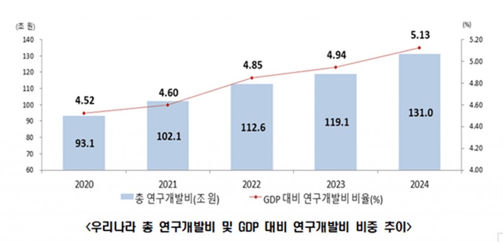 韓国の昨年の総研究開発費は131兆462億ウォン(約13兆8910億円)で、前年に比べて11兆9722億ウォン(約1兆2685億円)(10.1%)増加し、国内総生産(GDP)に対する研究開発費の比率は5.13%となり、イスラエル(2023年6.35%)に次いで世界第2位となった。