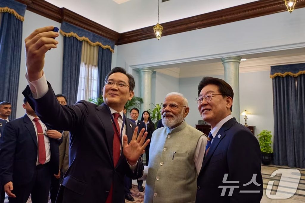 インドを国賓訪問した韓国のイ・ジェミョン(李在明)大統領が、モディ首相や、サムスン電子のイ・ジェヨン(李在鎔)会長とともに撮影した“セルフィー”が公開された。写真はインドで生産されたサムスン電子の最新折り畳みスマートフォンで撮影されたもので、韓印経済協力を象徴する場面として受け止められている。