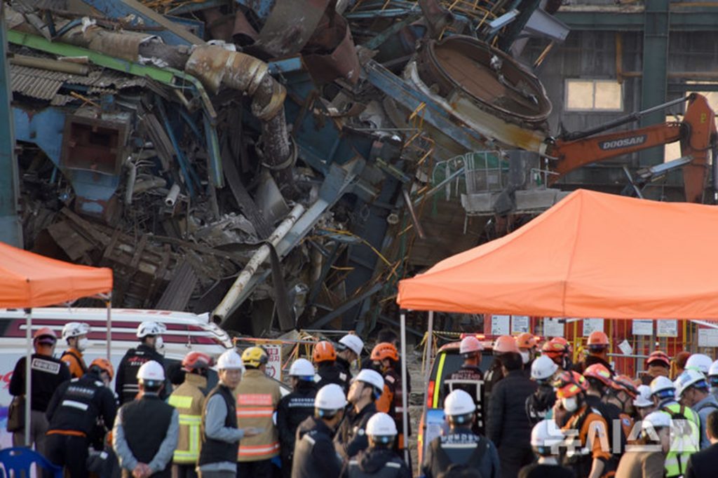 韓国・蔚山で6日午後2時ごろ、韓国東西発電の蔚山火力発電所内で、老朽化したボイラータワー3基(4・5・6号機)の解体作業中、高さ約60メートルの5号機が崩壊する事故が発生、作業中の9人が下敷きになった。うち2人は救助され、命に別状はない。救助隊は鉄筋などに挟まれた2人を発見したものの、うち1人は救助中に死亡、もう1人も死亡したもよう。さらに3人が見つかったが、生存情報はない。