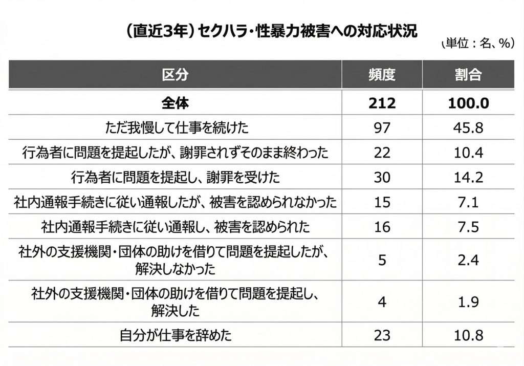 被害を受けた際の対応では、「そのまま我慢して働き続けた」が45.8%で最多となった。財団は、問題提起が難しく、被害を抱え込むケースが半数近くに達していると分析している。