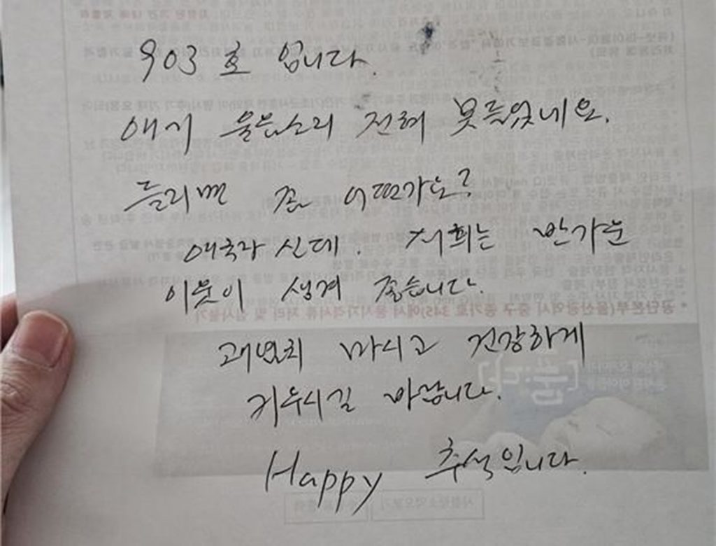 「903号室です。赤ちゃんの泣き声、全く聞こえませんよ。たとえ聞こえたとしても何か問題がありますか? あなたは“愛国者”です。私たちはすてきな隣人ができてうれしいです。気にせず元気に育ててください。ハッピー秋夕(チュソク=韓国の旧盆)を!」