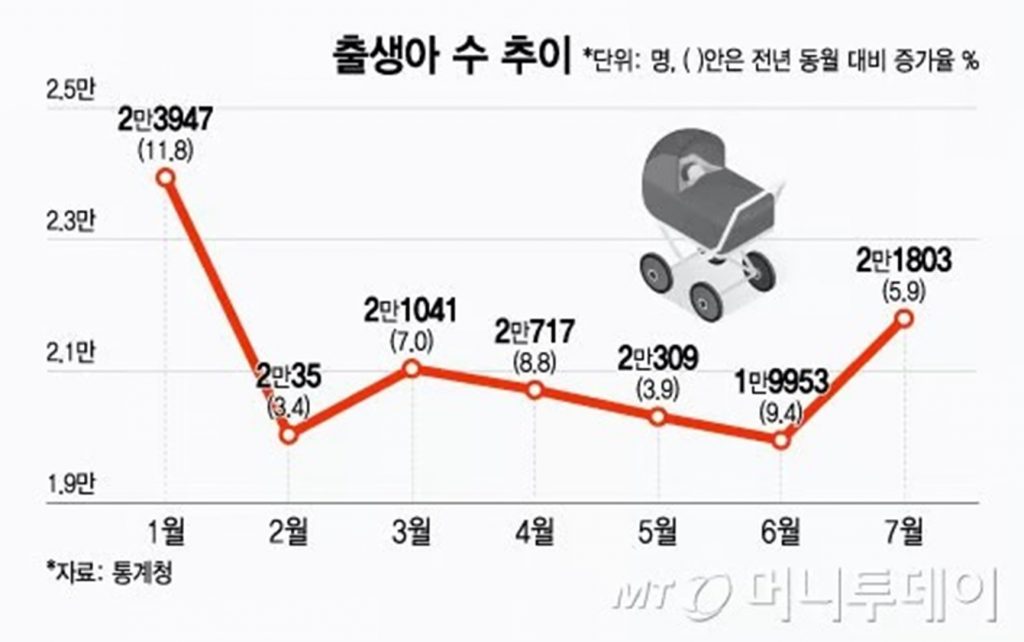 統計庁が9月24日に発表した「2025年7月人口動向」によると、7月の出生数は2万1803人で、前年同月比5.9%(1223人)増加した。これは2021年7月(2万2364人)以来、4年ぶりに最も多い。