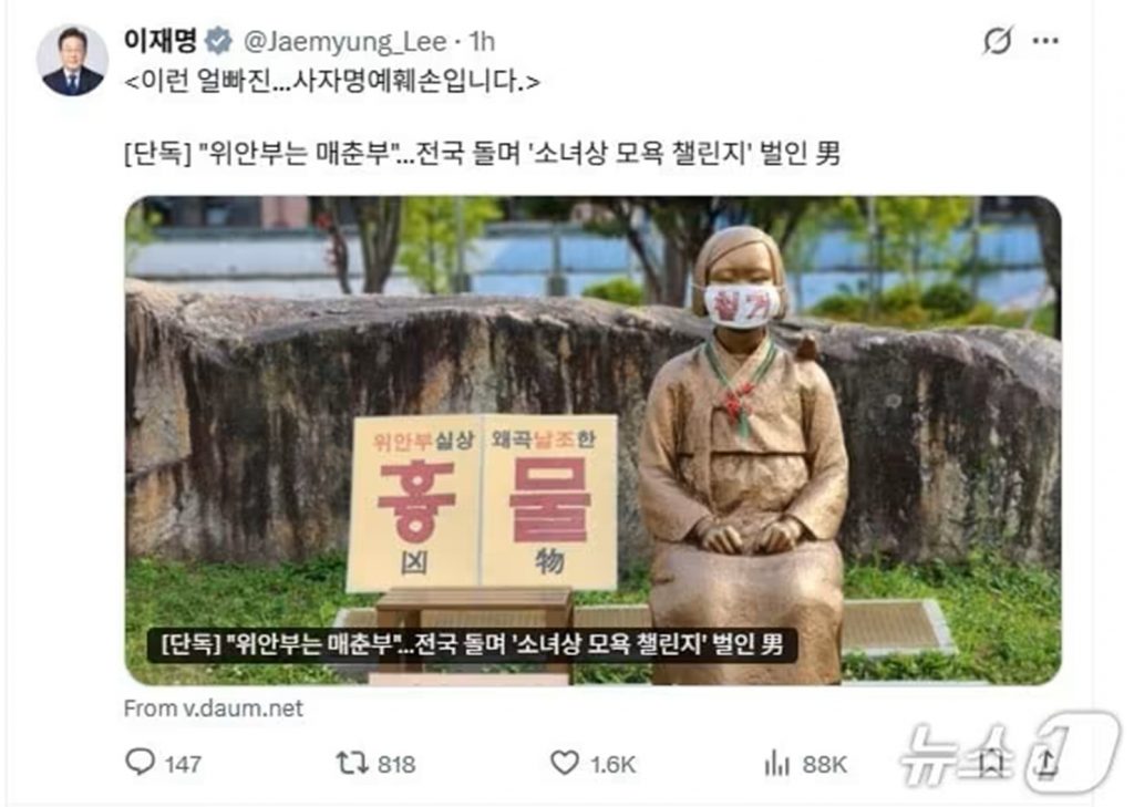 韓国のイ・ジェミョン(李在明)大統領は1月6日、「平和の少女像」を侮辱した極右団体に対し、「死者に対する名誉毀損だ」と厳しく批判した。