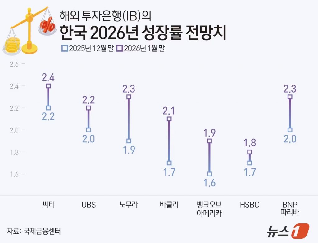 主要グローバルIB8社が示した2026年の韓国の成長率予測は、1月末時点の平均で2.1%と、12月末(2.0%)から0.1ポイント上昇した。韓国政府が提示した2.0%を上回る水準だ。