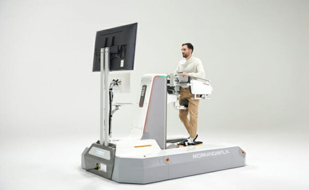 こうした問題に対し、同社は歩行リハビリロボット「モーニングウォーク」を開発した。足台型の訓練装置と体重支持機能を組み合わせ、安全に反復訓練ができる設計となっている。ロボットが転倒防止や動作の反復を担うことで、治療士は歩行パターンの分析や指導に集中できる。