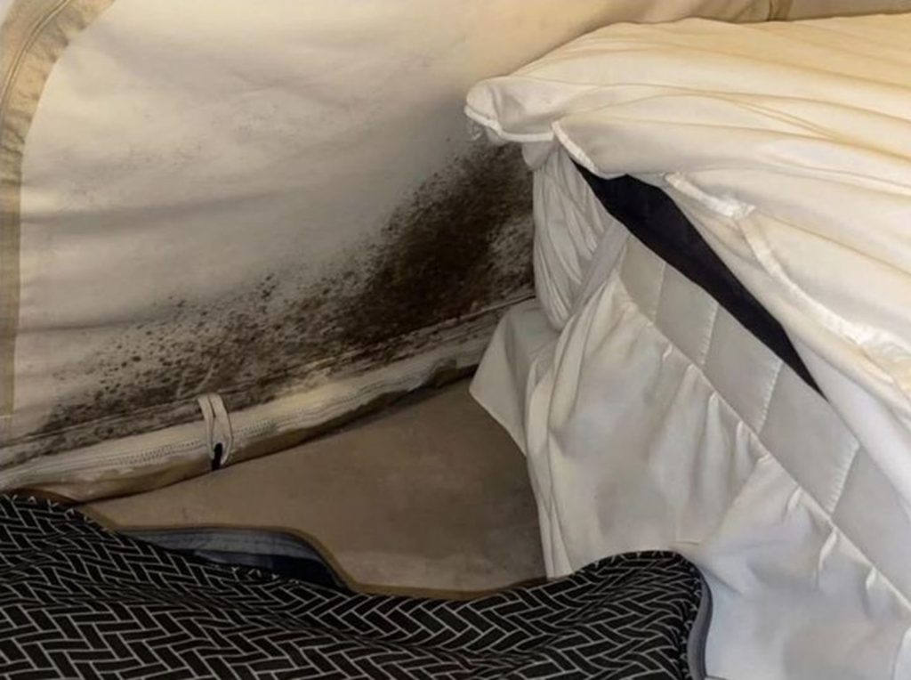 写真には、ベッドの後ろの壁一面に広がるカビがはっきり写っていた。男性は「壁とベッドが密着しており、寝ている間にカビを吸い込む恐れがある」と危機感を覚えたという。