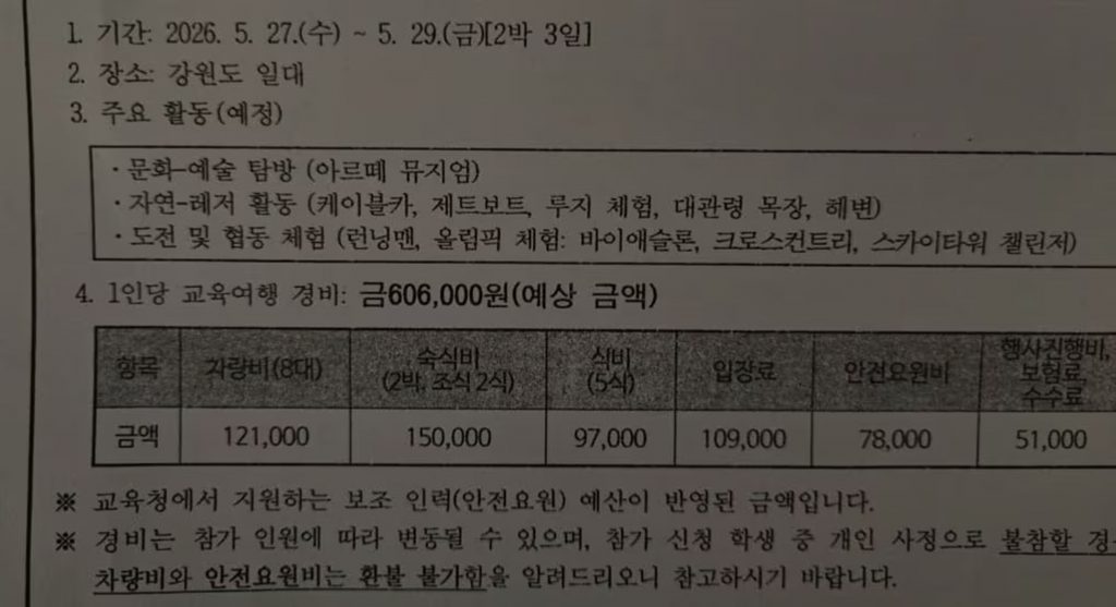 韓国江原道への2泊3日の修学旅行費が60万ウォンを超えるとして、保護者や生徒の間で議論が広がっている。
