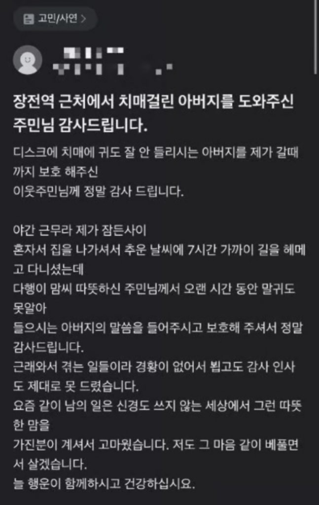 同社によると、釜山のある駅付近に住む利用者が18日、認知症を患う父親を無事に見つけることができたとして感謝の投稿をした。この利用者は夜勤中にうたた寝をしてしまい、その間に父親が一人で外出し行方が分からなくなったという。