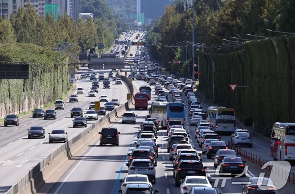 昨年の秋夕連休、下り線(右側)の車両が渋滞する京釜高速道路(c)news1