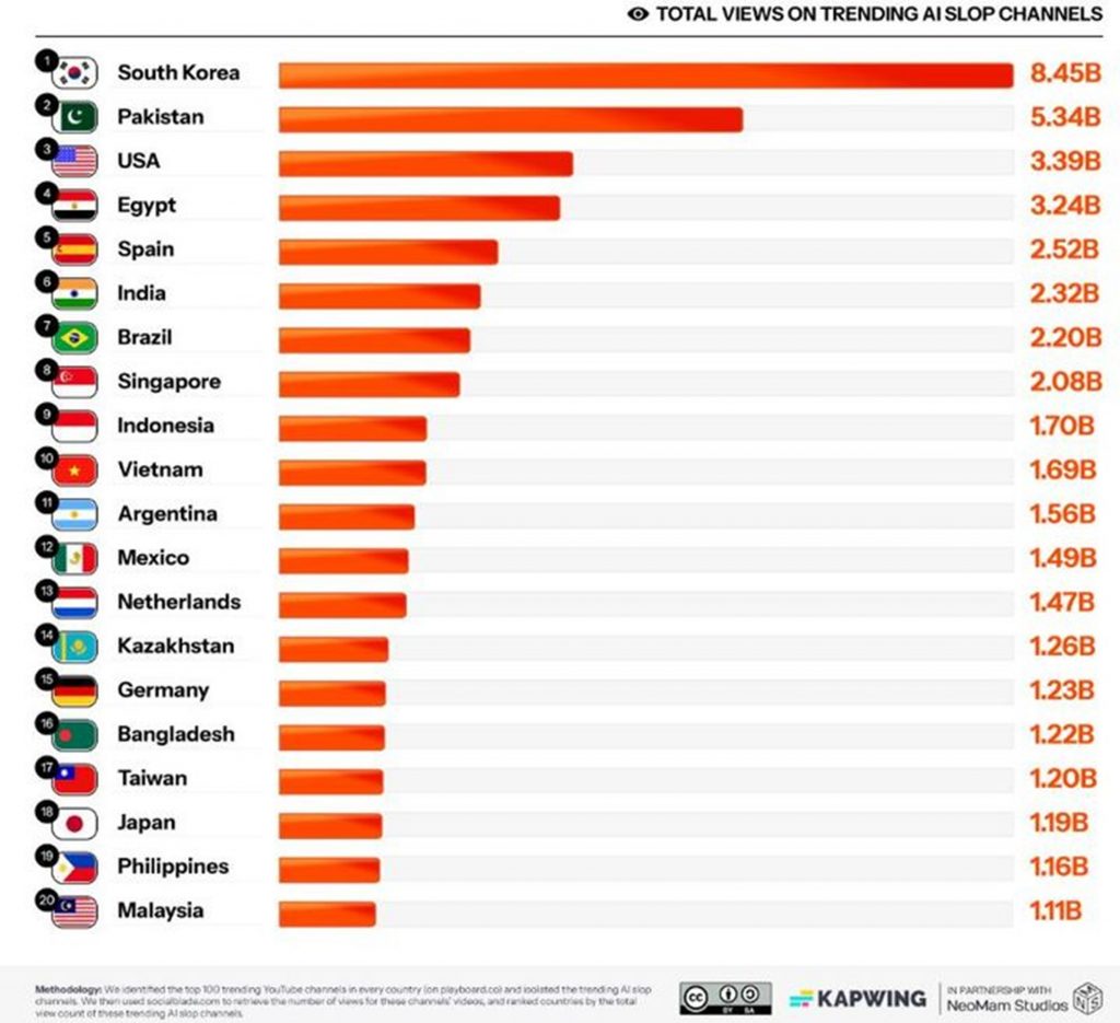 米国の動画編集プラットフォーム「カプウィング(Kapwing)」が2025年11月、各国の人気YouTubeチャンネル上位100件を対象にAI動画の投稿・再生状況を分析した結果、韓国拠点の「AIスロップ(AI Slop)」チャンネルによる動画の累計視聴数は84億5000万回に達し、調査対象国の中で最多となった。