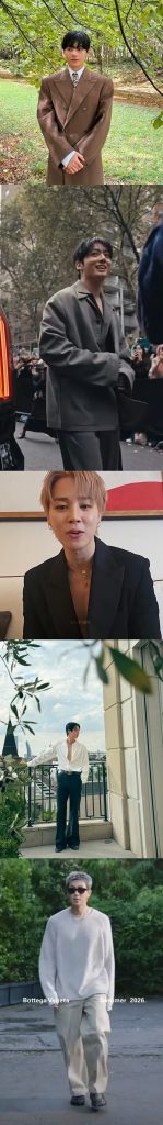 ジミンは10月1日、パリで開かれたディオールのショーに登場。黒のブレザーにレザーのパンツを合わせ、金髪スタイルで注目を浴びた。Vは10月5日のセリーヌのショーで茶色のオーバーコート姿を披露。ジンは9月24日、ミラノでグッチの公式ゲストとして白黒のアンサンブルで登場した。
