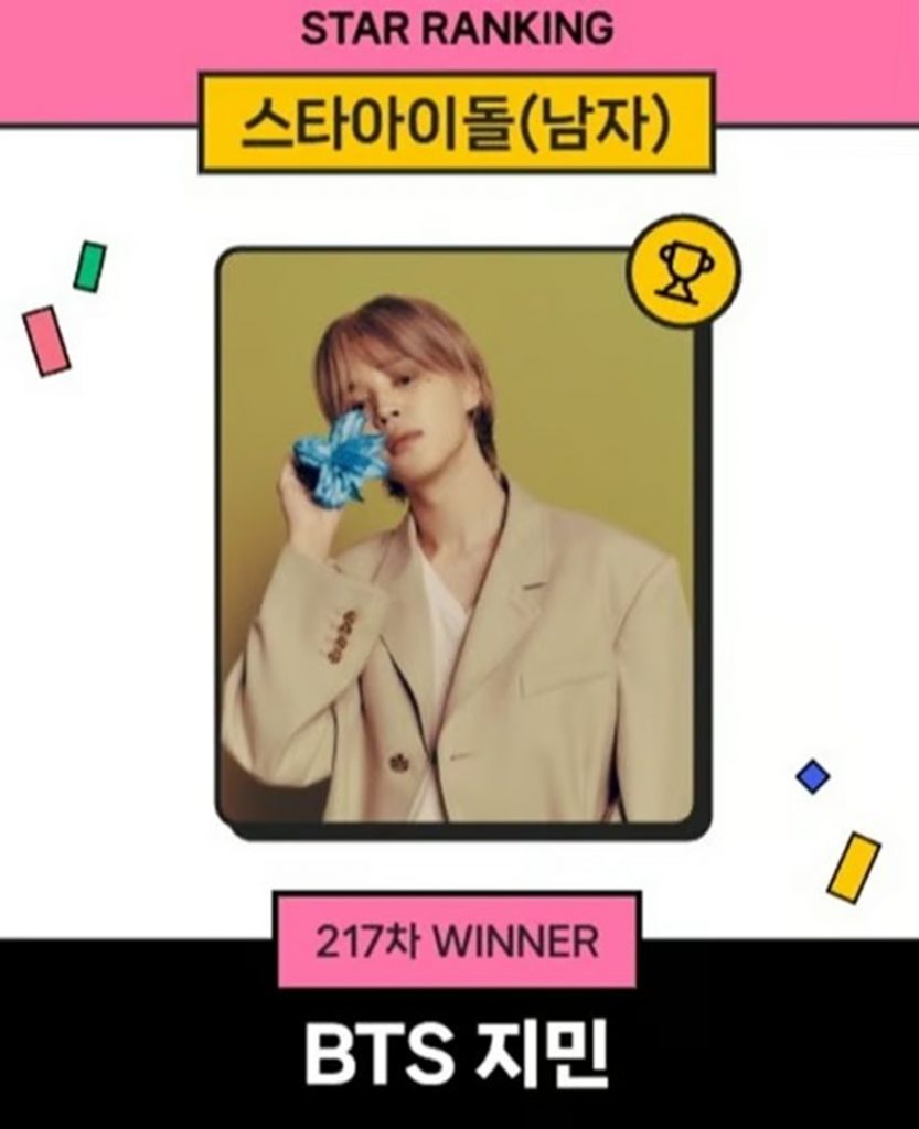 ジミンは18~25日に実施された第217回「スターランキング」男性アイドル部門の投票で4万6072票を獲得。初回から217週連続でトップを維持した。