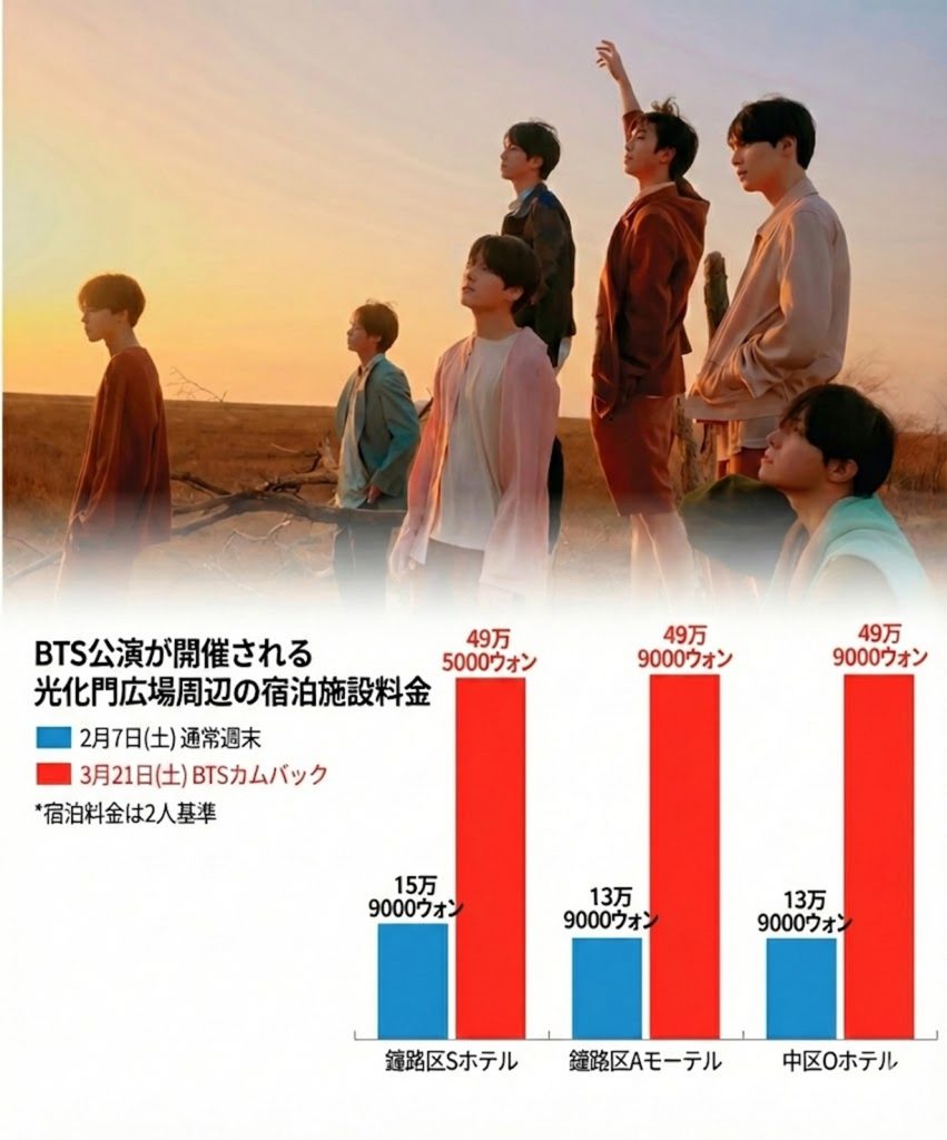 韓国のグループ「BTS(防弾少年団)」のソウル・光化門広場でのカムバックステージの3月開催により、光化門周辺の宿泊料金が急騰している。ソウル市は“ぼったくり料金”への現場点検に乗り出すとともに、宿泊業協会に対して自浄努力を要請している。